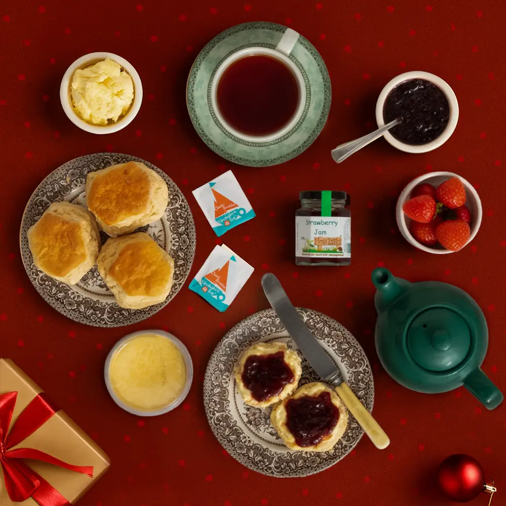The Christmas Cream Tea Hamper features everything you need for a true Devonshire cream tea, all in one beautifully presented gift.